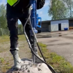 ②For preventing rock drill to bouncing around while operating, let the end of the rod closed to one of your feet and drill until the rock drill can be stably operated.